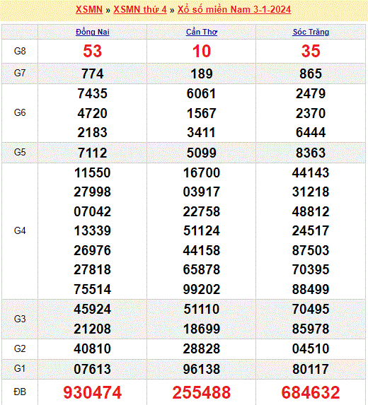 Mời mọi người cùng xem lại kết quả xổ số miền Nam tuần trước ngày 03-01-2024