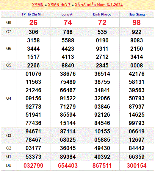Mời mọi người cùng xem lại kết quả xổ số miền Nam tuần trước ngày 06-01-2024