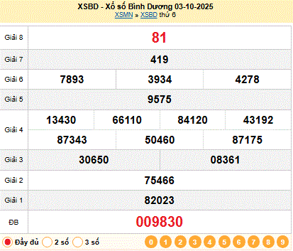 Kết quả xổ số Bình Dương XSBD 03-10-2025