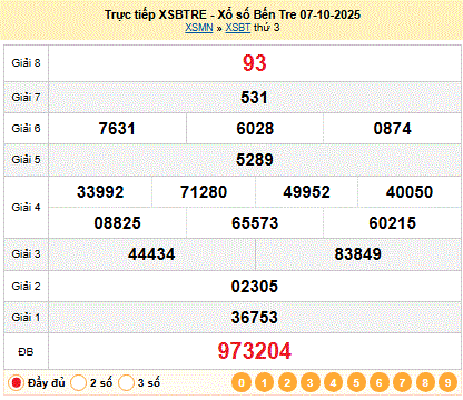 Kết quả xổ số Bến Tre XSBTR 07-10-2025