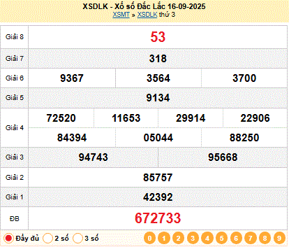 Kết quả xổ số Đắc Lắc XSDLK 16-09-2025
