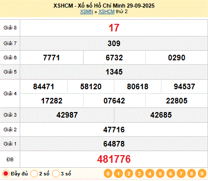 Kết quả xổ số Hồ Chí Minh XSHCM 27-09-2025