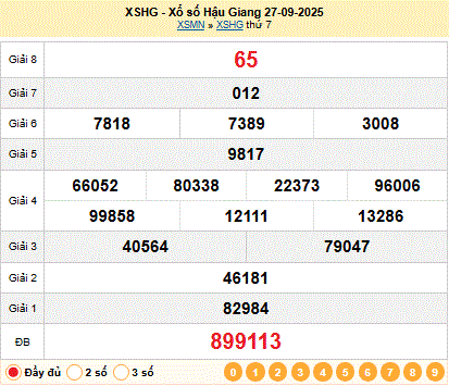Kết quả xổ số Hậu Giang XSHG 27-09-2025
