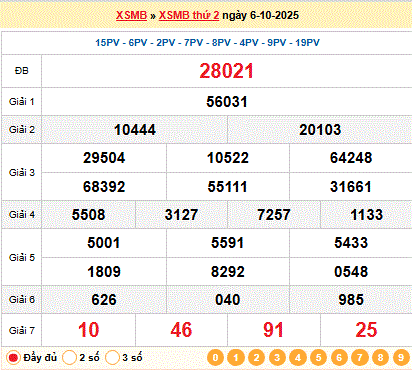 Kết quả xổ số miền Bắc ngày 06-10-2025:
