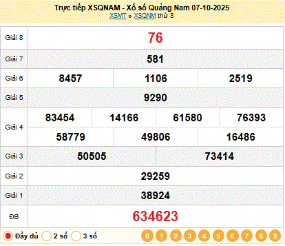 Kết quả xổ số Quảng Nam XSQNM 07-10-2025