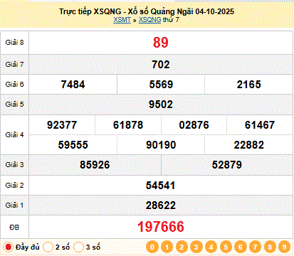 Kết quả xổ số Quảng Ngãi XSQNG 04-10-2025