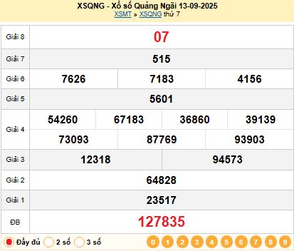 Kết quả xổ số Quảng Ngãi XSQNG 13-09-2025