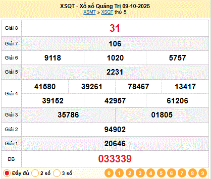Kết quả xổ số Quảng Trị XSQT 09-10-2025