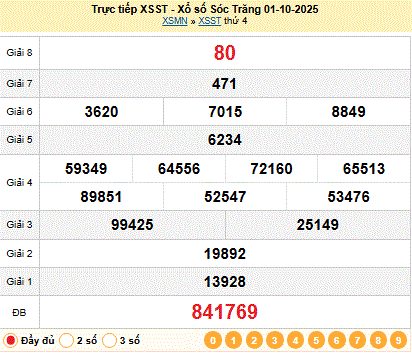 Kết quả xổ số Sóc Trăng XSST 01-10-2025